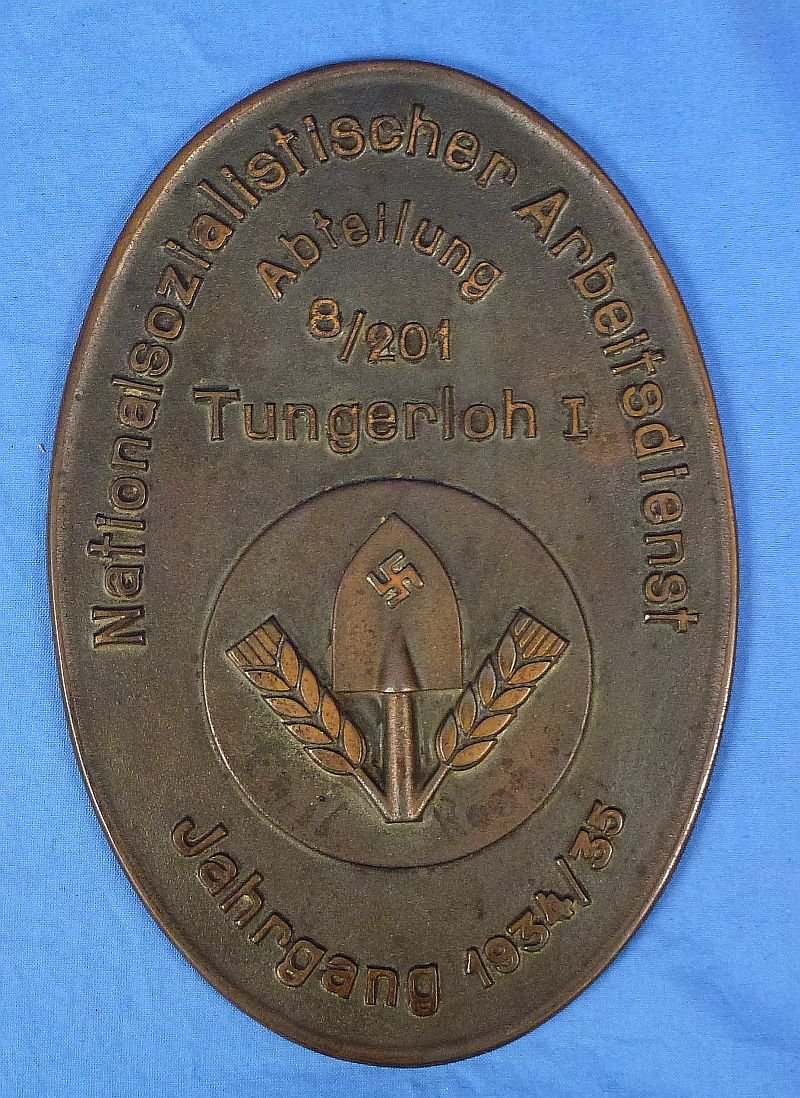 The bronze plaque is approximately 9 inches long and it commemorates service in RAD Abteilung 8/201 in Tungerloh I in 1934-1935. The plaque exhibits age and surface grime. The reverse top edge had a wire loop for hanging the plaque which is missing.