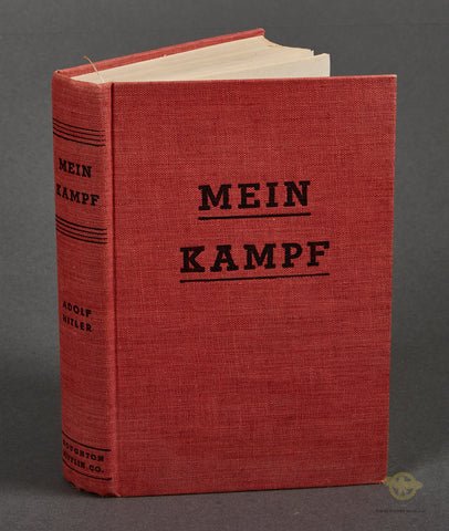 Rare 1943 English Mein Kampf translated by Ralph Manheim-This is a red linen hardcover that is the first English translation of Mein Kampf, it is nicely dated 1943. This was published by Houghton Mifflin in Boston. This contains 692 pages and includes an index which is unusual. There is also a preface, table of contents, and a translators message, which is not usually included in the German version. Missing is the page with Hitler's portrait. This book shows some age spotting but is in overall very good condition. A rare book to encounter, we see many later English language copies, but not these original 1943 versions very often.