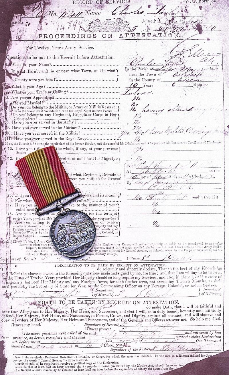 Medal(s) Verification: Driver Charles Taylor of the Royal Regiment of Artillery is confirmed entitled to the Afghan Medal with no clasp as well as an Army Long Service Good Conduct Medal per below cited medal roll & referred to extant service papers:- Afghan War Medal 1878-80. No clasp: WO 100/54- Army Long Service & Good Conduct Medal. Victorian issue: Army Order 103 of 1897The recipients service papers are extant and accessible at The National ArchivesCharles Taylor eldest son of John Taylor (an Agricultural Labourer) & Mary Anne Taylor (nee Everitt) was a native of Layer Marney, Colchester, Essex, England, where he was born in 1859, and where he was baptised. At the time of the compilation of the 1871 National Census for England & Wales, Charles was living with his parents and 4 x siblings (sister Kate, Taylor and younger brothers, John Taylor, James Taylor & George Taylor) at their residence located at, No 38 Cottage, Layer Marney, Essex, England. A telling reality of the era is that Charles was returned in the Census as an 'Agricultural Labourer' - he was only 12 years of age! By trade a 'Labourer', Charles was 19 years of age, when, on 19 May 1879 he enlisted at Colchester, Essex, for service with the British Army. Initially he had signed-on to complete, 12 years service 'With The Colours', this subsequently extended, so he could complete 21 years service. On attestation, 21 May 1879, Charles was posted to the Royal Regiment of Artillery. On 15 March 1880, he embarked on the 'Euphrates' for overseas service in India. In 1900 Charles Taylor was still serving with the British Army, and was discharged 'Dead' at Seaforth, Lancashire, England on, 17 August 1900, cause of death being 'Acute Pneumonia'. At the time of his death Charles Talor had completed a total of 21 years & 89 x days service, and held the Afghan Medal 1878-80 and the Long Service & Good Conduct Medal. His record of service was:- Home: 21/05/1879 - 14/03/1880- India (inc Afghanistan): 15/03/1880 - 28/04/1887- Home: 29/04/1887 - 17/08/1900The following regimental abstract of service in the Afghan War 1878-80 is taken from the standard reference for that war, viz 'The Afghan Campaigns of 1878-1880 (S. H. Shadbolt, 1882)':Quote,H BATTERY, Ist BRIGADE, R.A.In the autumn of 1878, Battery H/i, R.A., under the command of Major F. A. Pritchard, was ordered up from Secunderabad to Multan, and throughout the first campaign, and during part of the second, remained stationed there as a unit of the Reserve Division of the Army employed in the Southern theatre of operations.In the autumn of 1880 the battery, under the command of Major C. Crosthwaite, took part in the advance of General Phayre's Division to Kandahar, where it arrived at the latter end of September.With the remainder of General Phayre's Division, the battery marched to Dahila, in the Argandab Valley, on the 7th Oct., and remained there until orders were received to move again into Kandahar. On the final evacuation of the city in June, 1881, the battery returned to India.UnquoteAn attractive medal fitted with an old length of stitched riband, almost certainly as worn by the recipientCondition: GVF
