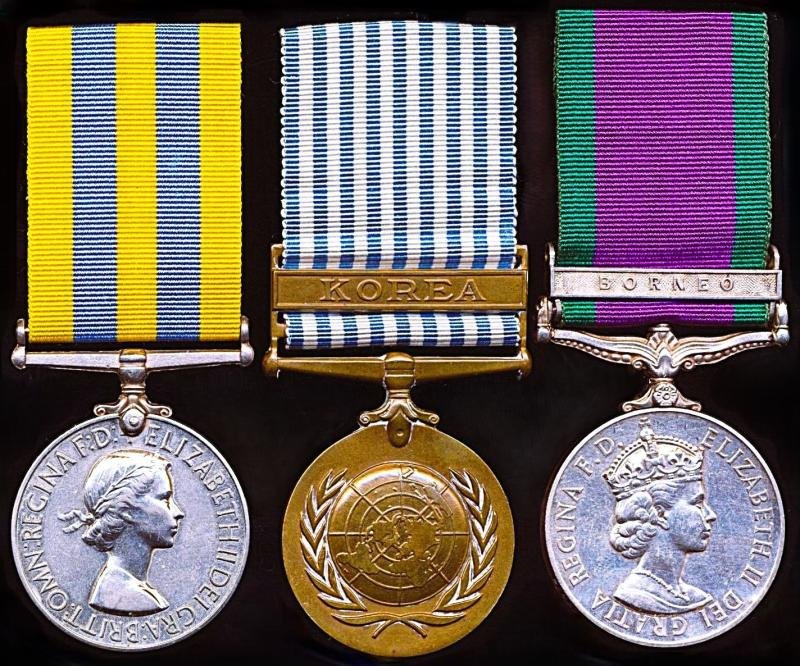 - Korea Medal 1950-53. 1st issue (2758006 Sjt. J. S. Young. B.W.)- United Nations: Service Medal with 'Korea' bar- General Service Medal 1962-2007. With clasp 'Borneo' (27658006 Sgt. J. G.Young. RAPC.)Note the Korea Medal with middle forename initial 'S' (sic) and the GSM medal with an extra digit (sic). The medals otherwise exactly as issued and never returned for correctionThe recipients unique Army Number is from the block allocated to the Black Watch (Royal Highland Regiment) in 1920, and awarded sequentially to all new enlistees to the Black Watch (Regulars & Territorials'). this indicating that the recipient had enlisted in the British Army and been posted to a battalion of the Black Watch, sometime prior to 1942Medals Verification: None of the medal rolls for any of the recipients medals are accessible in the public domain (as of writing), and WW2 British Army medal index cards are a notoriously incomplete records series. We can however furnish details of the recipients full medal entitlement, basis our previous ownership of this medal group (see attached medal image of the group we previously handled)- 1939-45 Star- Africa Star. With clasp '8th Army'- Italy Star- Defence Medal- War Medal- Korea Medal (2758006 Sjt. J.S. Young. B.W.)- United Nations: Service Medal with clasp 'Korea'- General Service Medal 1962. With clasp 'Borneo' (27658006 Sgt. J.G. Young. RAPC.)John Gilbert Young, son of Private John Young, 3rd Battalion Royal Scots & Robina Young (nee Goldie), was a native of, Canonmills, Edinburgh, Scotland, where he was born, 16 April 1916. At the time of his birth, his father is shown as a serving 'Private' with the 3rd Battalion Royal Scots. After service in the Second World War, and the Korean War, during which conflicts John served with the Black Watch, he is known to have transferred to the Royal Army Pay Corps circa 1956. RAPC records (Regimental Journal) show that he was promoted Corporal, 7 August 1956. He was promoted Sergeant, 7 August 1961, and served overseas in Hong Kong Colony from August 1962. John took his final discharge from the British Army, 25 June 1969. After leaving the British Army, he took up employment as a 'Clerical Officer', and is recorded to have died at The Royal Star and Garter Home at Richmond, near London. At the time of the issuance of the deceased's 'Death Certificate' he was described as a 'Clerical Officer (Retired)' and that prior to his death his usual residence address had been 'Union Jack Club, Sandell Street, Waterloo, London. S.E.1.Sold together with some copied hard-copy researchA fine and desirable medal grouping to a former 'Jock' of the 'Red Hackles', and whose full medal group is worthy of reconstitution as a record of a very full military careerThis sale is for the Korea, UN Korea & GSM medals - the illustration of the recipients full entitlement is only here shown as an illustrative prop for provenance purposesCondition: Mostly GVF