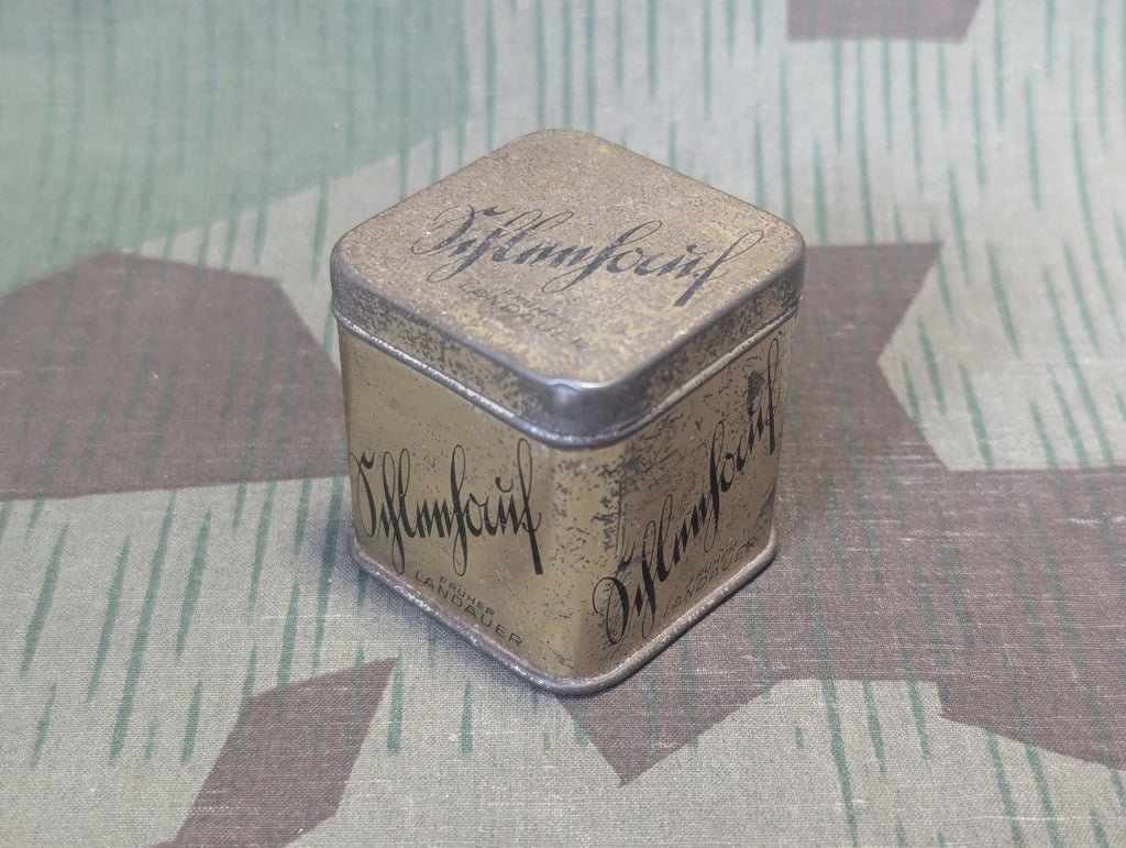 Original Schleehof Früher Landauer (Schleehauf formerly Landauer) tin. Landauer was a Jewish department store that was sold to a German employee, Adolf Schleehauf in 1936. Schleehauf paid a fair price and, because of that, was also subject to boycotts as a 'Judenknecht' (Jewish lackey). The Sütterlin writing on the tin is to appear more German.I am unsure what this small tin was originally for. I assume some sort of food stuff, like tea or bullion cubes. The tin itself only has the store name. It is in decent condition with wear.The German informational picture is from a PDF from the Landesarchiv Baden-Württemberg.