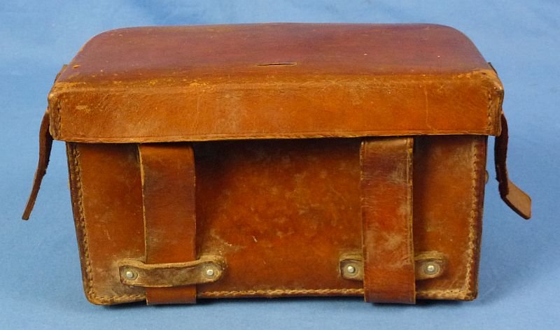 The brown leather medical equipment pouch is approximately 2-1/2 inches long by 5 inches tall by 5 inches deep. The pouch shows spots and minor scuffs, but it is complete and intact and in overall very good condition, with much of the contents label remaining on the interior of the lid.