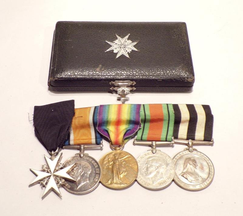 A WW1 British War and Victory Medal correctly named to R R Hines British Red Cross & St John of Jerusalem. WW2 Defence medal and St Johns service medal, plated type and the silver and enamel Order of St John of Jerusalem officers breast badge in box of issue a black space is left on the medal bar for the order to be clipped on when worn but can be stored in its case.Robert Ralston Hines was born in Aston Warwickshire on the 16th March 1896. His father Robert was a Jewler and silversmith and he became the manager of a Silver Plating works for a Birmingham maker. His mother Elizabeth enjoyed a typical middle-class life of the Edwardian era; Robert Jnr was their only child.He enlisted into the St Johns Ambulance as Orderly in January 1917 and served in France until the armistice in November 1918. After the war he became a Manager at Hampton Optical Co, in Essex Street Birmingham. He must have continued a close connection to the St Johns Ambulance receiving the service medal after ten years of service. He served with St Johns Ambulance during WW2, probably being of great use during the Birmingham Blitz giving much needed first aid. He was made Officer Brother of the order of St John on 17th November 1954 for distinguished service to the Order.More research is needed on this man; however his group comes with various copied research including medal index card and medal rolls, census details etc.Medals are un good condition, mounted on bar with light contact marks to rims.