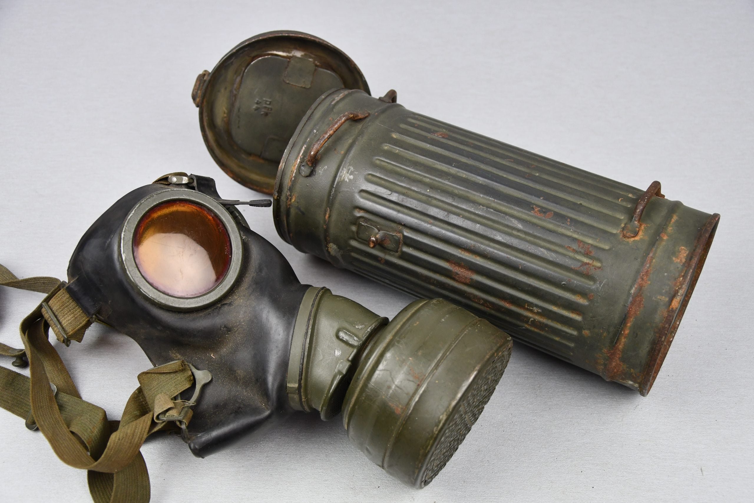 Well preserved German rubber based gas mask in good condition. Complete with filter. Nice canister, still retains most of its original greenn finish. Canvas pull string remains present. Maker marked and dated 1944.