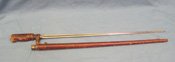 Original era manufacture. Now this is an odd one, a full length cruciform blade with a hooked guard but without a lock mechanisim. The entire bayonet/sword was at one time completely encased in brown leather. Most of that covering remains except on the tip of the guard and scabbard. Why and to what purpose this was done is conjecture. Perhaps a self-defense baton, carried by an officer or NCO. The the blade is straight, scuffing to the leather surfaces as shown. We've never seen one like it.