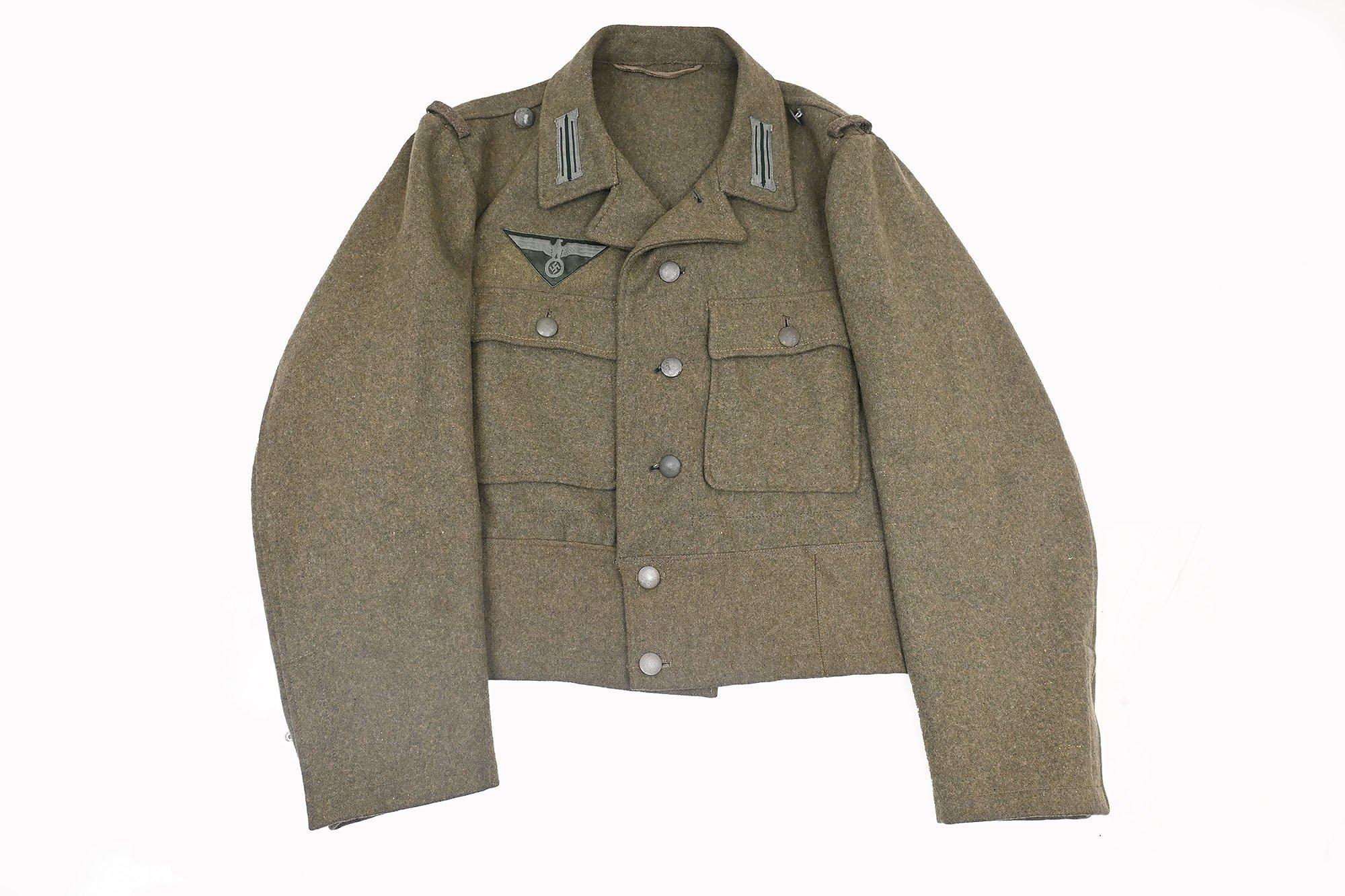 WH (Heer) M44 field blouse (Feldbluse). This field blouse from the late war period is made of a field-grey/brown wool/rayon blend and features two pockets with straight flaps and field-grey finished, granulated metal buttons. The blouse fastens with six buttons at the front, also of the same type. A machine-applied, woven breast eagle in M44 style, made of BeVo fabric, is attached to the field blouse. Two collar pins are machine-sewn to the collar. These collar pins have the standard green color of the army unit. The various army units within the German army had a specific identification color ('Waffenfarbe') which was generally displayed on the collar pins. An exception to this were the general service collar pins (Einheitskragenspiegel) for enlisted men and non-commissioned officers, which did not have an army unit color and could therefore be worn by personnel of all army units. The shoulder patches have loops and buttons. The inside is largely unlined, with brown/grey rayon reinforcement at the seams and for the two inner pockets. The tunic is neatly marked with RB.Nr. and dated 1944 (E44). The lower part of the tunic appears to have been altered, possibly slightly shortened; see photos for more details. A beautiful original M44 field blouse from the late war period; the price is adjusted accordingly due to the reapplied insignia!