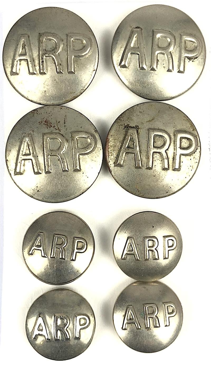A scarce original circa 1939 set of 'Air Raid Precautions ARP bluette overall nickel buttons'; four large examples all with maker's details 'Buttons Limited Birmingham' and four small all with maker's details 'Smith & Wright', 'H &H Ltd B'Ham x2', 'Cheney B'Ham'. Good condition, complete with original shanks.Diameter approx 23mm. and 16mm.