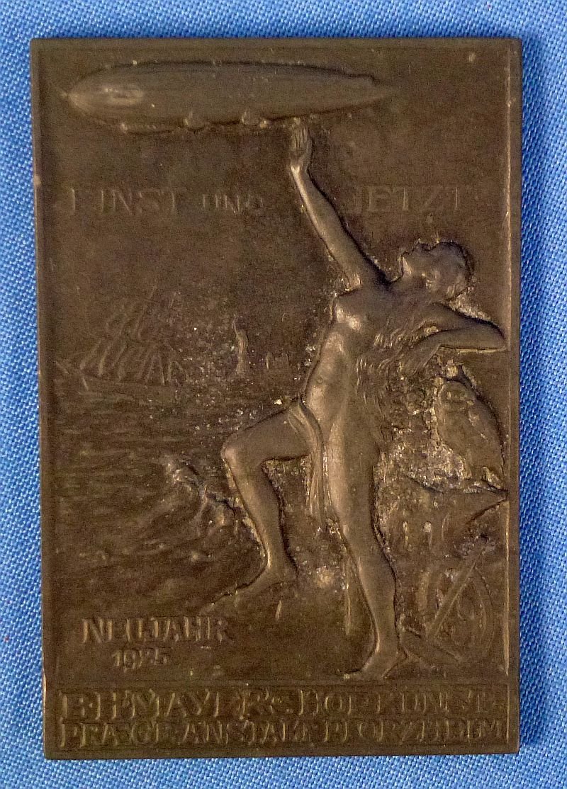 The table medal is approximately 1-3/4 inches by 2-1/2 inches. The obverse depicts the image of a woman holding a zeppelin aloft. The base of the obverse bears the designation of 'Neujahr 1925' ('New Year 1925') and 'B.H. Mayer's Hof-Kunst-Praege-Anstalt Prorzheim' ('B.H. Mayer's Court Art Minting Institute Pforzheim'). The firm of B.H. Mayer was a producer of insignia and medals during the Third Reich, with its own assigned RZM code. Very good condition.