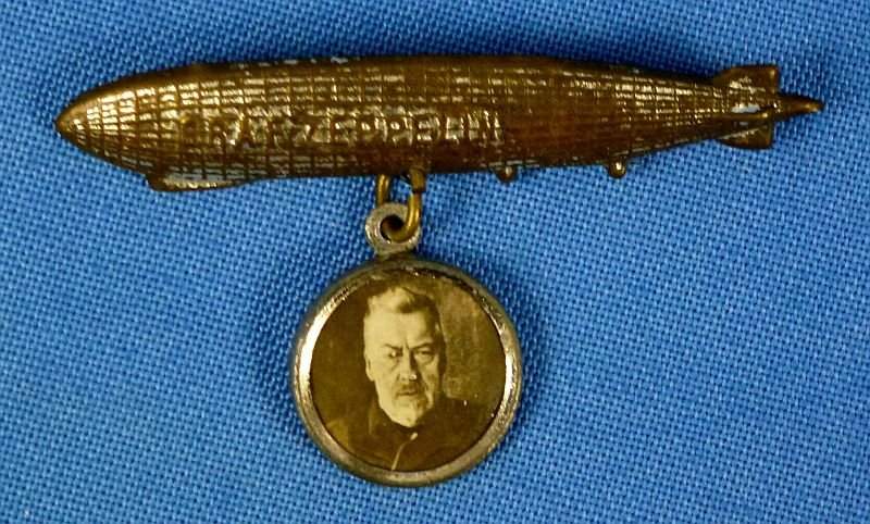 The zeppelin badge is approximately 1-5/8 inches long. The badge shows wear to the finish. Suspended from the zeppelin is a photograph ofCount Ferdinand von Zeppelin.
