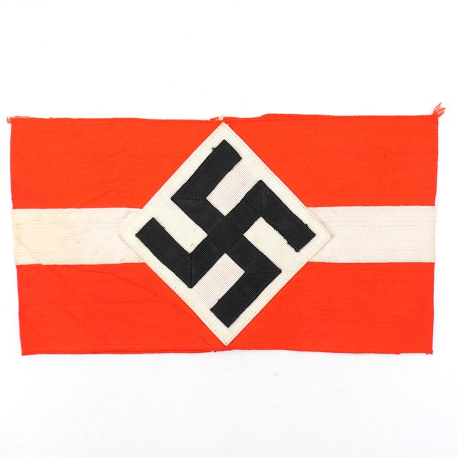This is a nice Hitler-Jugend Member's Armband (Armbinde) as worn by HJ members on the upper left sleeve on almost all HJ uniforms. The multi-piece construction red coloured armband shows an white stripe in the middle and has a ribbed rayon white diamond, with black-coloured ribbed rayon mobile swastika, attached. Remains of the original RZM label are still present on the inside. The armband shows some minor staining and traces of usage. Rarely seen variant of the HJ armband in very good condition!