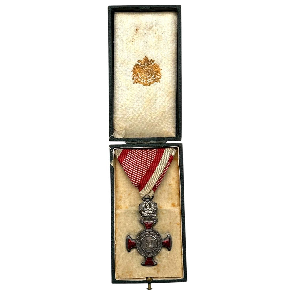 Original Austrian-Hungarian Silver Merit Cross from 1849, complete with its original presentation case.This decoration was instituted during the reign of Emperor Franz Joseph I and awarded for distinguished civil or military service to the state.The cross features the classic design with red enamel arms and a central medallion bearing the 'FJ' monogram, representing Franz Joseph.Around the medallion appears the motto 'Viribus Unitis', the personal motto of the emperor meaning 'With united forces'.The reverse side displays the date 1849, marking the year the decoration was established.The medal is suspended from the characteristic red and white ribbon associated with Austrian imperial awards.The piece is housed in its original presentation case by J.G. Bergmann, Vienna, a well-known manufacturer of award cases.Article number: 18618