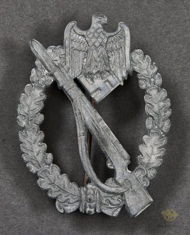 Veteran Bring Back German WWII Infantry Assault Badge in Silver-This is a slightly vaulted example made of zinc. This badge has lost the majority of its silver finish, except for what remains in the lowest details of the wreath and eagle. This badge has very good details. The zinc has toned to a nice light gray color. There is a little bit more of the silver finish remaining on the reverse, near the hinge and catch. The pin setup functions as it should. Overall, this is a very good example. We were able to purchase this medal directly from the family of the US Veteran. We will supply the name and any other information we have to the buyer. This is a good example overall.