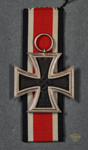 German WWII Iron Cross 2ndClass 1939 w/Ribbon by Klein & Quenzer-This is a very good example of the iconic Iron Cross. The black iron core has a finish that is 98% intact The only finish loss can be seen on the top arm of the cross where it meets the top of the silver frame. This is very slight so we are being conservative saying 98%. You be the judge.. The silver frame is nicely toned. There is a good portion of original ribbon include, this is very clean and vibrant. This is marked on the ring with '65' for the maker Klein & Quenzer of Idar-Oberstein. This is an excellent offering! $250History: The German Iron Cross of 1939, awarded during World War II, was a reintroduction of the historic Prussian Iron Cross by Adolf Hitler at the start of the conflict, featuring a swastika in the center and a ribbon incorporating the colors of the TR regime (black, white, and red) instead of the traditional Prussian black and white stripes. This medal was essentially a way to continue the tradition of military valor recognition while aligning it with the new ideology.