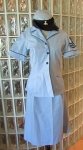 Wanita Damian was born July 13, 1911 and enlisted in the WAVES November 2, 1944 and served in our Navy until August 30, 1968.This uniform is her seersucker blue and white shirt, skirt and hat.Very nice condition. One button is in the pocket but just slips on.The hat is a size 22 and retains the metal WAVE insignia in the center. Some light soiling in two spots possibly from storage.The top has a 28 inch bust, blue trip and shoulder sleeve insigniaThe skirt has a 26 inch waist and is 26 1/2 inches long