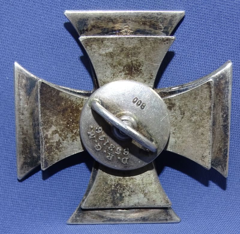Vaulted magnetic cross with silver frame marked 900, with hallmark of Meybauer, Berlin. Inner retaining cross-like plate, in silver, marked 500 and outer fastening device, marked D.R.G.M. 653146, and silver hallmarked 800. The core retaining most of its original black finish and the silver exhibiting toning.