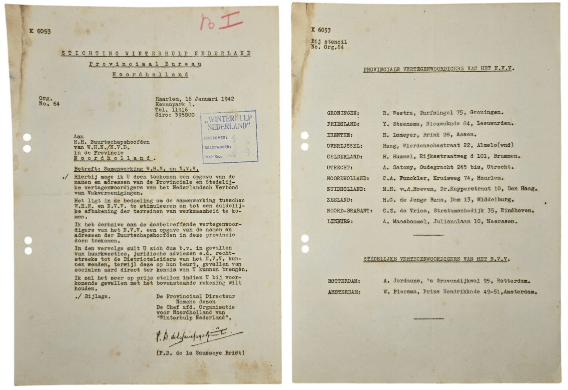 Original WW2 Dutch Collaboration WHN Document - Winterhulp Nederlandcircular collaboration WHN & NVV, Haarlem(1942)Origineel Wo2 Nederlands Collaboration WHN Document - Winterhulp NederlandCirculaire WHN & NVV collaboratie, Haarlem(1942)