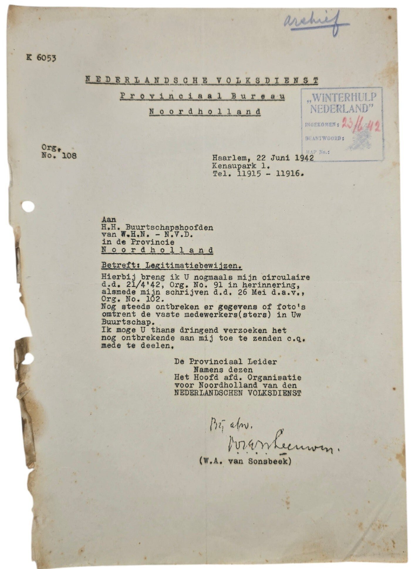 Original WW2 Dutch Collaboration WHN Document - Winterhulp Nederland circular ID-cards, Haarlem (1942)