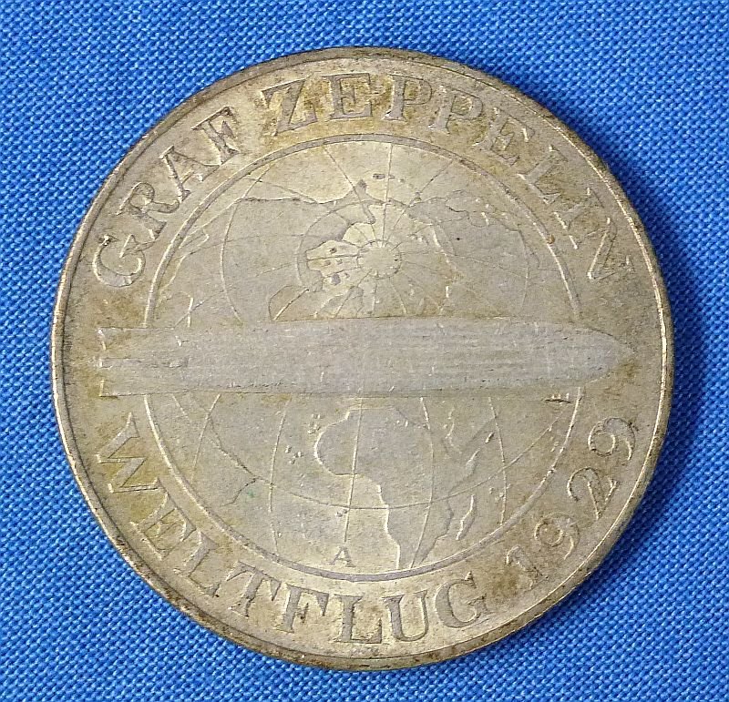 1930 German 5 Reichsmark Silver Coin Commemorating the World Flight of the Graf Zeppelin Airship