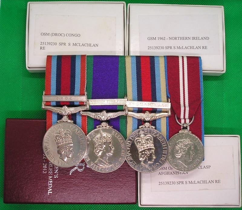 O.S.M with D.R.O.C clasp, GSM 1962 With Northern Ireland Clasp, O.S.M with Afghanistan clasp & 2012 diamond jubilee claspTo- 25139230.SPR.S.McLACHLAN.R.EStephen McLachlan enlisted 4-9-2001 & served with the Royal engineers until he left the service 17-12-13.All four medals are confirmed on the recipients record of service which states he was awarded both of his OSM & his GSM in 2007 & his diamond jubilee in 2012. The O.S.M with D.R.O.C clasp is extremely rare as only 105 medals with this clasp were issued to the British army in total.NEF & Mounted as worn. Complete with good quality colour copies of the recipients service records. Along with all the original boxes of issue & a colour copy photograph of the recipient in uniform on his wedding day wearing all four medals. Plus copies of the recipients technical qualification certificates & some other interesting details about the recipient & the D.R.O.C campaign. He served in the Democratic republic of the Congo, Op Veritas in Afghanistan & Op Banner in Northern Ireland.