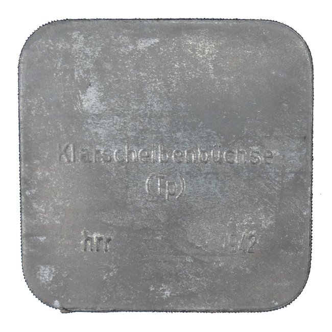 Tropical set of Wehrmacht Gasmask Spare Lenses (Klarscheiben Tropen). Still sealed in their original square (6,5 x 6,5cms sized) metal container, closed with black sealing tape. The container is marked with 'Klarscheibenbüchse (TP)' and maker marked and dated 'hrr 1942'. These are often missing pieces and perfect to complete your gasmask set with. These will also fit in the small compartment inside the Fallschirmjäger Gasmask Pouch. Rare original set in good unissued condition!