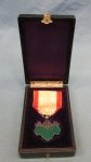 Original era manufacture. Silver medal of the pre 1940 variety with enameling on both sides of the planchet. Nice lacquered wood issue case, ribbon very lightly soiled from handling. The small metal locking clasp is intact.