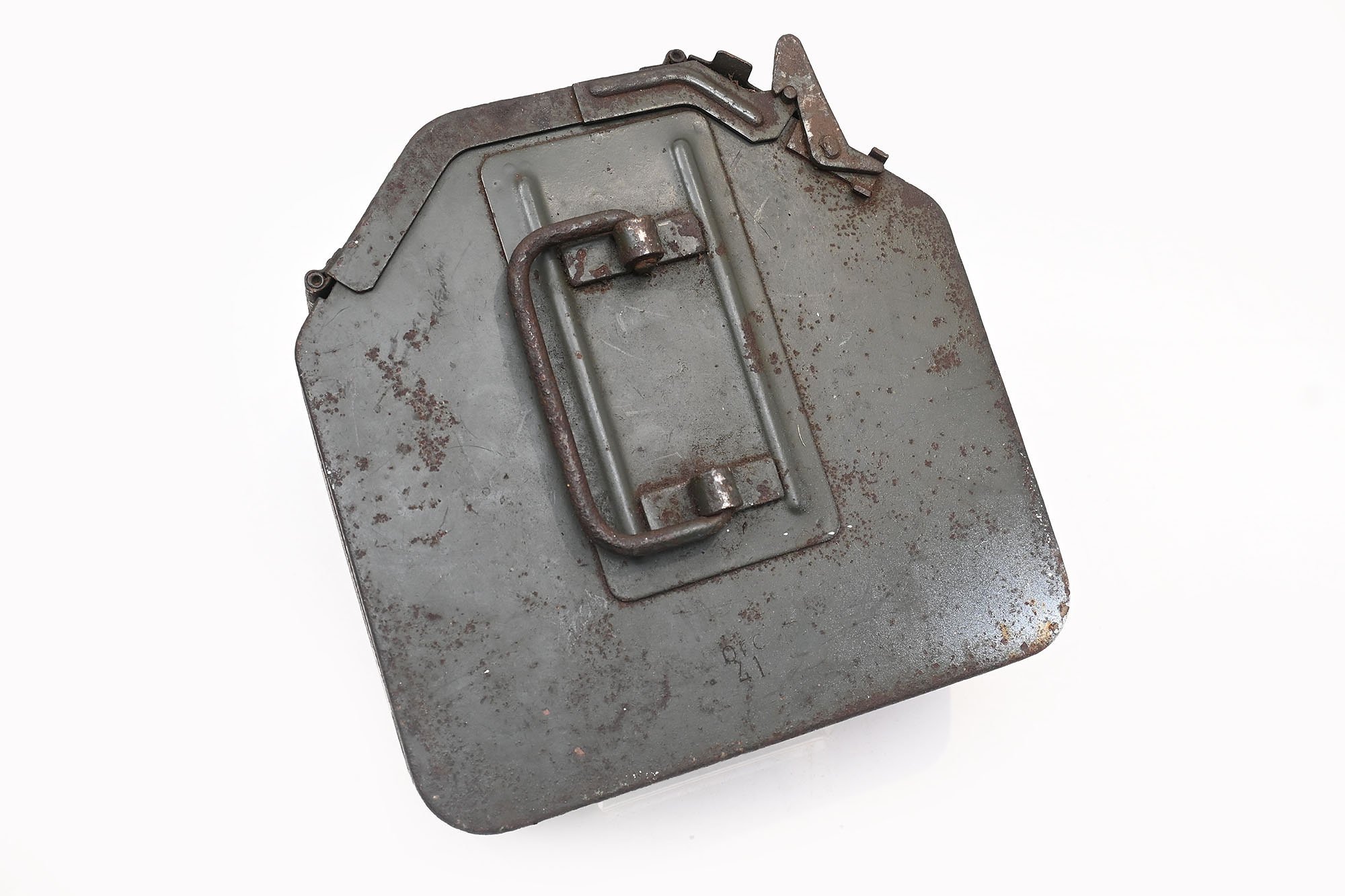 MG34 or MG42 ammunition box for use on a vehicle compartment (Patronenkasten 36). The box was suitable for a 150-round ammunition belt and was developed for use on armored vehicles. The box still retains its original paint and shows some rust and scratches from use. The box is nicely maker marked and dated 'brc 41', indicating production in 1941. This is the second box model with a spring-loaded closure. A fine example in good used condition!