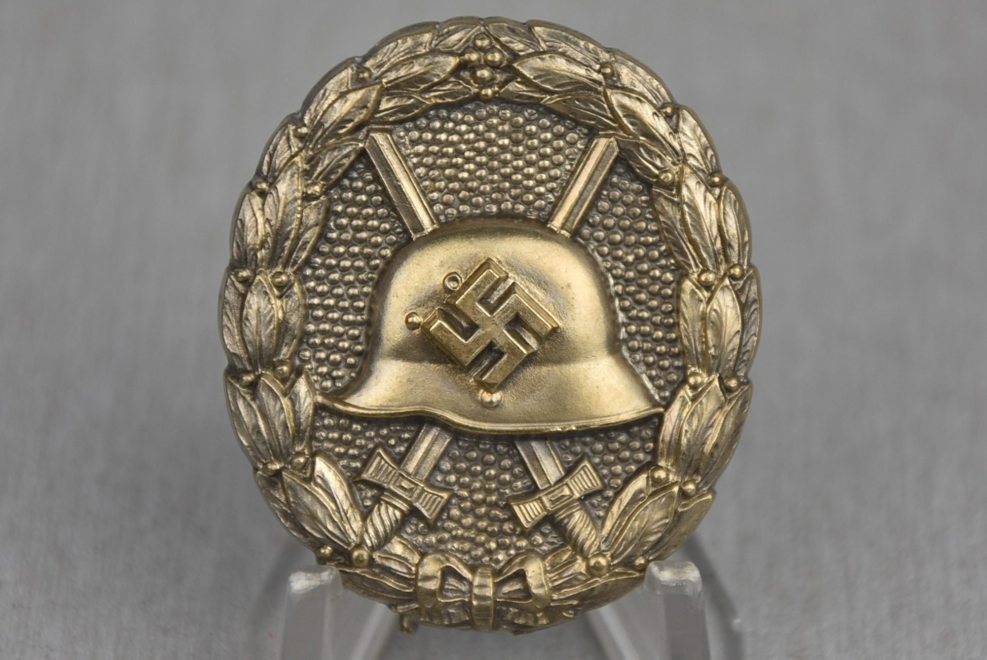 Hard to find 'first pattern' silver wound badge. These were awarded to members of the Condor Legion and/or first wounded of the Blitzkrieg in 1939/1940, hence the nickname of these badges 'Condor Wound Badge'. These badges had the WW1 design with a swastika added on the steel helmet, the first examples were actually real overstock from WW1 with a swastika added, later they made them like this. This example is made out of buntmetall. Interesting example – very hard to encounter nowadays.
