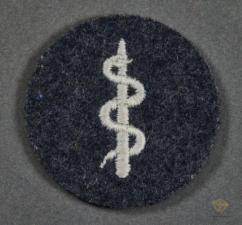German WWI Luftwaffe Medic Specialty Patch-This is a trade or career patch for a medic in the Luftwaffe. This is machine embroidered, with a striking Rod of Asclepius embroidered onto Luftwaffe blue-gray wool. It is not piped, so this would be worn by an NCO or EM. The reverse backing retains a small portion of paper backing. Near excellent.