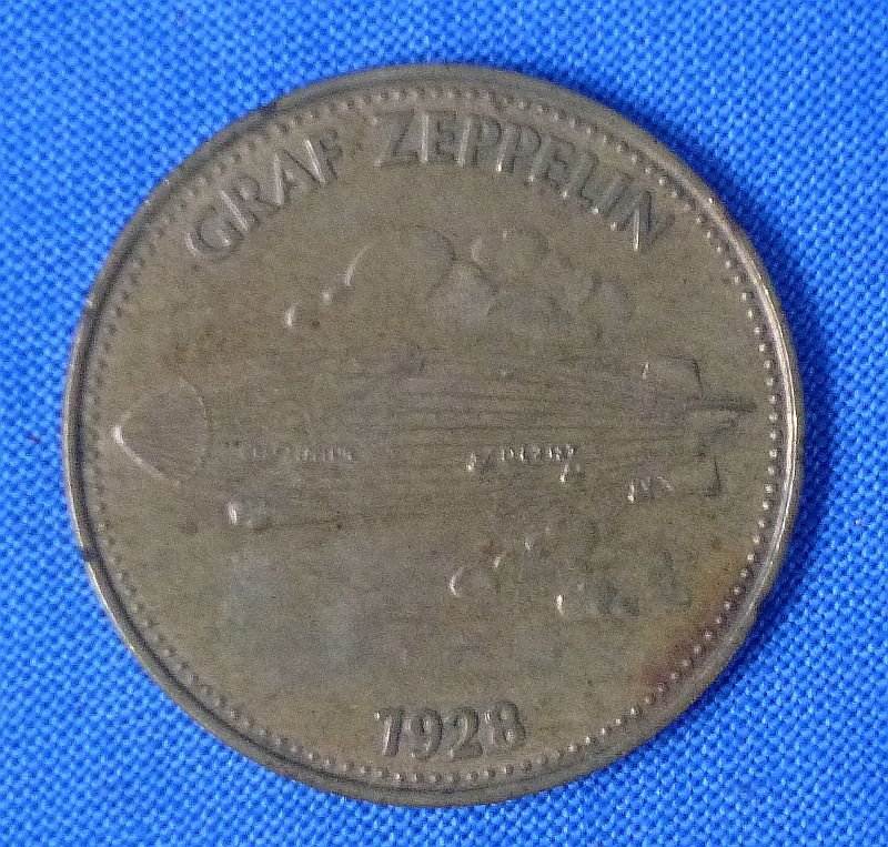 The bronze-aluminum token is approximately 1 inch in diameter. The token features an image of the Graf Zeppelin airship with the text 'GRAF ZEPPELIN' and the year '1928'. The token exhibits uncleaned patina.