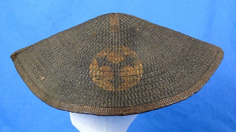 Japanese Edo period samurai war hat nirayama jingasa kabuto made of finely hand-woven bamboo fiber with a black lacquered exterior, adorned on each side with gold samurai nobility family crest. 20 inch diameter, interior retains the paded head cords. The hat exhibits age and use, with some edge wear, but overall the hat is in very good condition