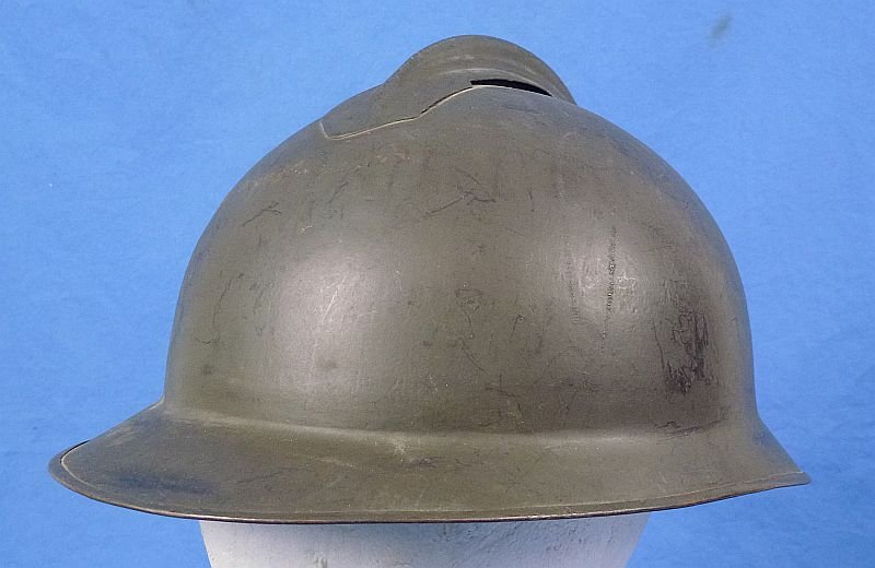 The helmet exterior shows spots, scratches, and some small areas of surface rust. The interior liner remains largely present, with some tears and separations. The leather chinstrap is intact on one bale but torn off of the opposite bale. Overall good field used condition.