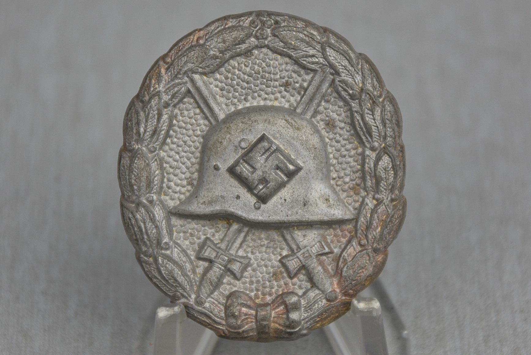 Hard to find 'first pattern' silver wound badge. These were awarded to members of the Condor Legion and/or first wounded of the Blitzkrieg in 1939/1940, hence the nickname of these badges 'Condor Wound Badge'. These badges had the WW1 design with a swastika added on the steel helmet, the first examples were actually real overstock from WW1 with a swastika added, later they made them like this. This example is made out of zinc with silver finish. The pin set-up is a classic design used by GWL (Gebruder Wegerhoff & Lüdenscheid) Interesting example – very hard to encounter nowadays.