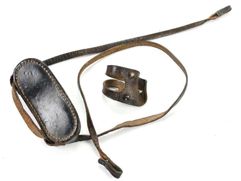 In a very good condition a stunning German Wehrmacht Wartime Period Binoculair Parts Set.The set contains the neck strap, button attachment strap and the raincover in brown leather.A very nice set!