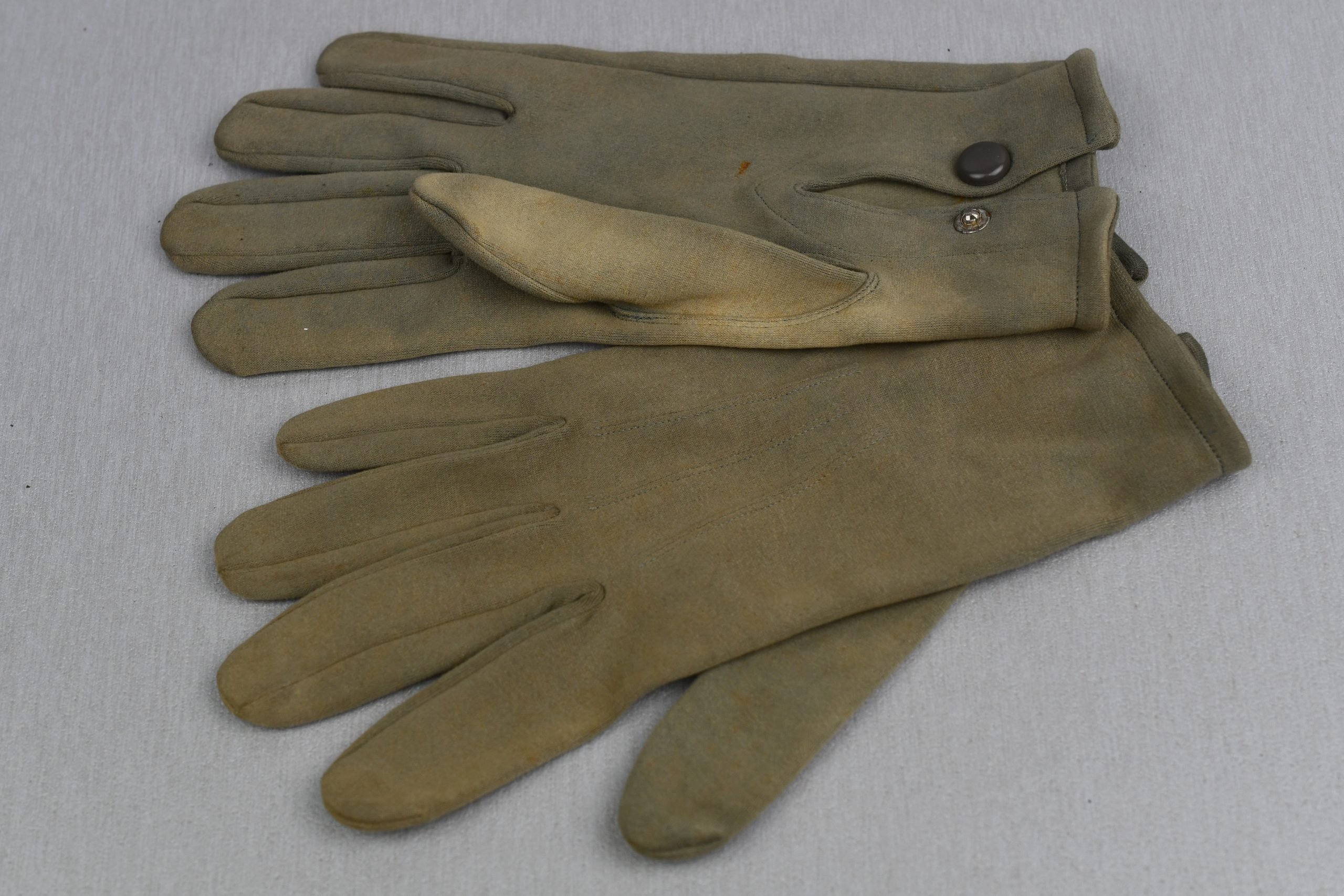 Genuine pair of suede officer gloves in light worn condition. Functional press buttons.