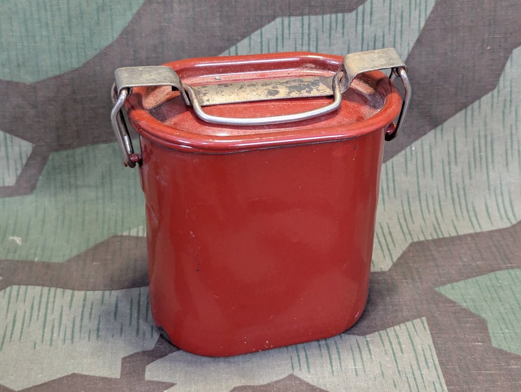 Period German Drexler red enamel food container with an extra insert. The inside is gray enamel. There are a few small chips, inside and out, the insert bowl is quite nice. There are some red rubber gaskets inside but they are a little crunchy, one is broken. I do not know if they are the correct size or even usable, but they came with it, so they will stay with it.