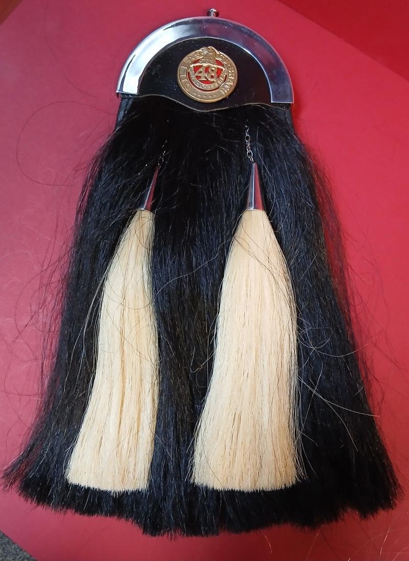 .FULL PATTERN:48TH HIGHLANDERS OFCANADAMilitary issue pattern black horse hair sporran with two white tassels as supplied to the pipers of regiment. Chrome sporran cantle with leather insert featuring the 48TH HIGHLANDERS OFCANADA sporran badge. The back has a military format back purse with flap