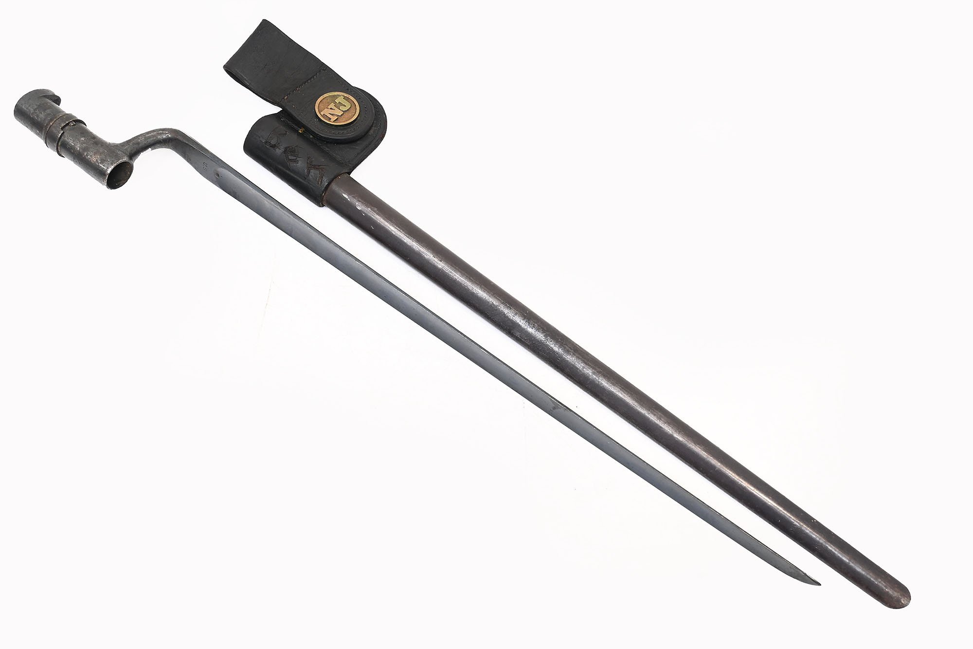 Original example: Only one available. The Springfield Model 1873 'Trapdoor' was the first standard breech-loading rifle adopted by the U.S. Army. The rifle, in both the long and carbine versions, was widely used in later battles against Native Americans. It was the weapon, in its carbine form, used by the soldiers of the 7th Cavalry Regiment who fell in the Battle of Little Big Horn in 1876.This example is in very good used condition, with a beautiful patina reflecting its age. There is some rust on the sleeve, as is common. The marking 'nj' on the ricasso, which stands for New Jersey,is correct. The locking ring moves smoothly and still has the correct locking screw.The bayonet comes with the original steel scabbard with belt loop. Like the bayonet, the scabbard has a beautiful patina used over the years. Most of the original finish has been preserved.The leather belt loop is in good condition.A very fine American Trapdoor bayonet with original scabbard. Ready to mount on your Springfield 1873 Trapdoor rifle!Specifications:Blade length: 45.7 cm (18 inches)Blade shape: TriangularTotal length: 53.3 cm (21 inches)Sheath length: 47.7 cm (18 3/8 inches)