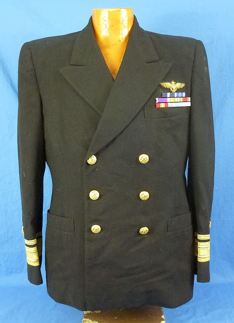 The dark blue wool reefer jacket bears the gold bullion wings of a U.S. Navy aviator, with the rank insignia of a Rear Admiral on the cuffs. Below the wings are ribbons reflecting service in the Pacific Theater in World War II as well as the Korean War, together with the awards of the Navy Cross and the Distinguished Flying Cross. The interior pocket retains a tailor label and the name 'McKemie, G.W.'. The tunic is in excellent condition.