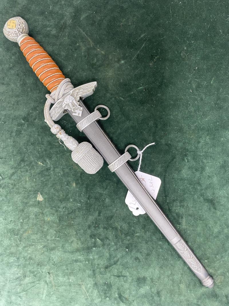 An extremely pretty example of the 2nd Pattn Luftwaffe dagger. Deep orange grip on one side, lighter on the other! Has 98% of the ORIGINAL airplane grey finish to all the exterior fittings. Original 23cm bullion knot tied in place around the grip, in mint condition. Blade is the usual nickel plated variety used by SMF and is in stone mint condition. The seated king SMF trademark, along with a stamped Waffenampt mark are on the reverse riccasso. A really superior looking dagger in amazing condition. SPECIAL OFFER…… I WILL SUPPLY A SET OF DE-LUX LUFTWAFFE HANGERS FOR £100 (usually £225) TO WHOEVER BUYS THIS DAGGER.The sale of Knives and other Edged Weapons are restricted to those aged over 18. Verification of age is required before purchase is concluded.'