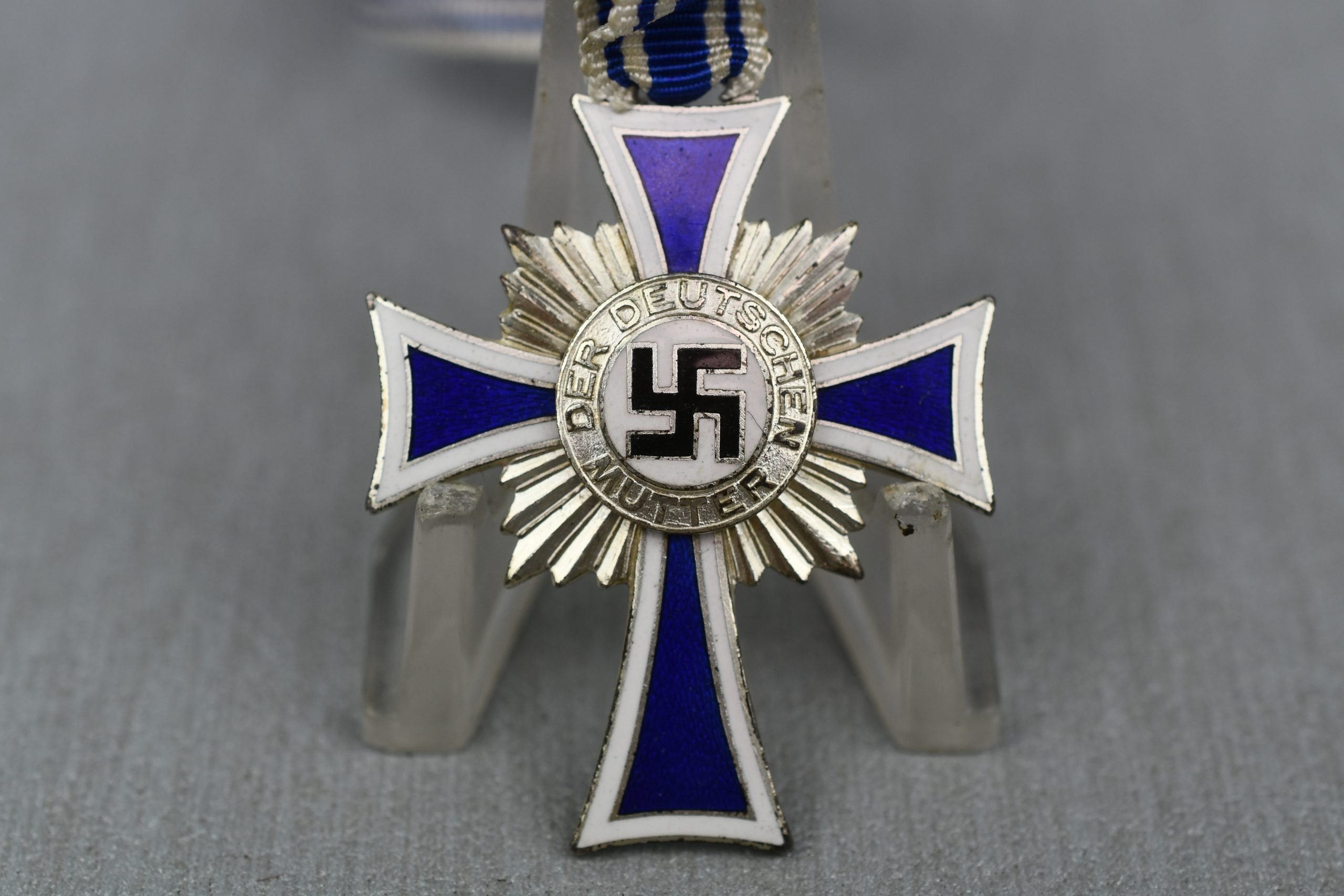 Silver mother's cross, in good condition, complete with ribbon. Ribbon nicely attached with press button to wear.Ehrenkreuz der deutschen Mutter 2. stufe was awarded for exceptional merit to the German nation.' (to Reichsdeutsche and Volksdeutsche mothers who exhibited probity, exemplary motherhood, and who conceived and raised six or seven children in the role of a parent).