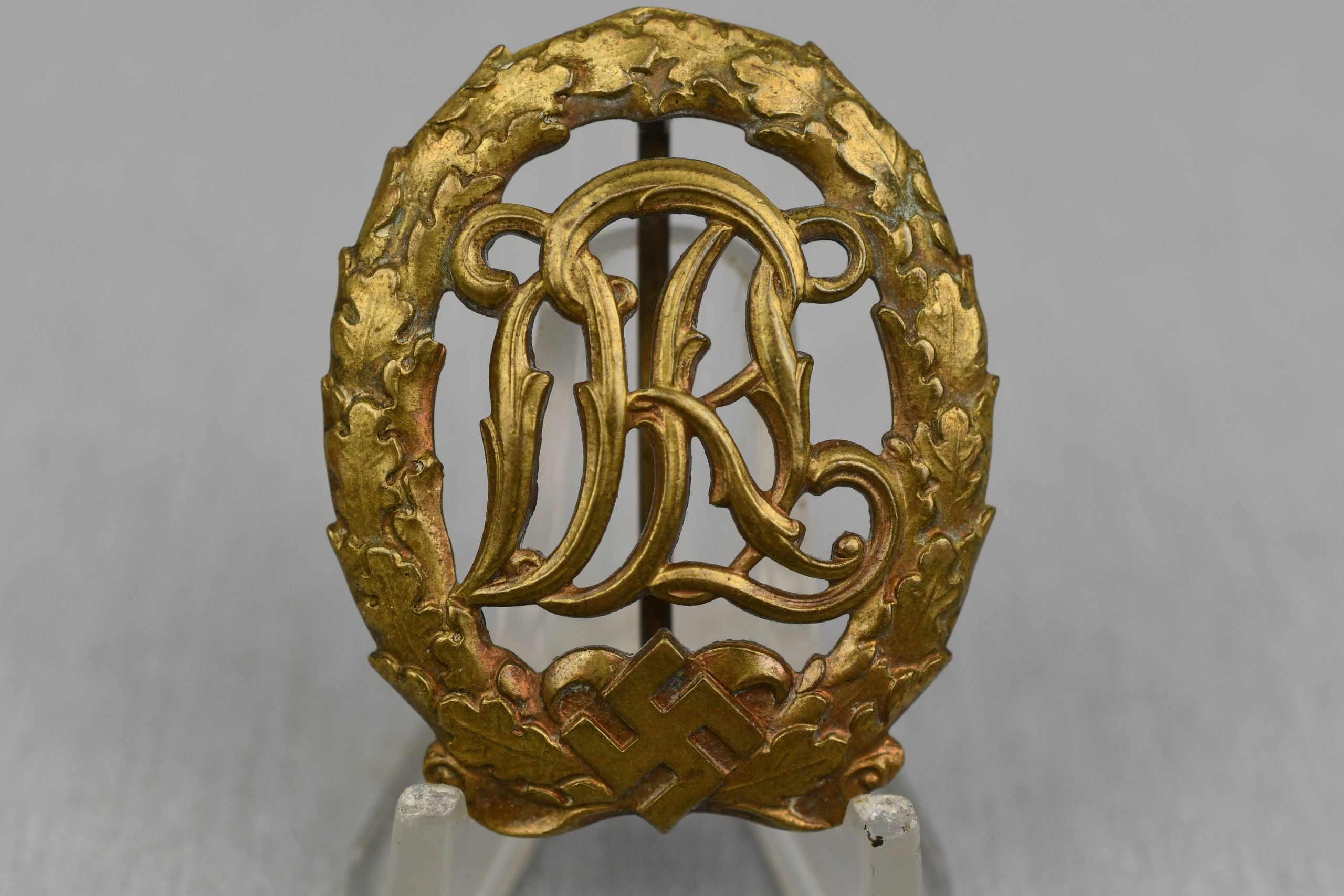 Genuine bronze grade DRL sportabzeichen marked by Ernst L. Müller – Pforzheim – DRGM 35269, a rarely encountered manufacturer for these badges.