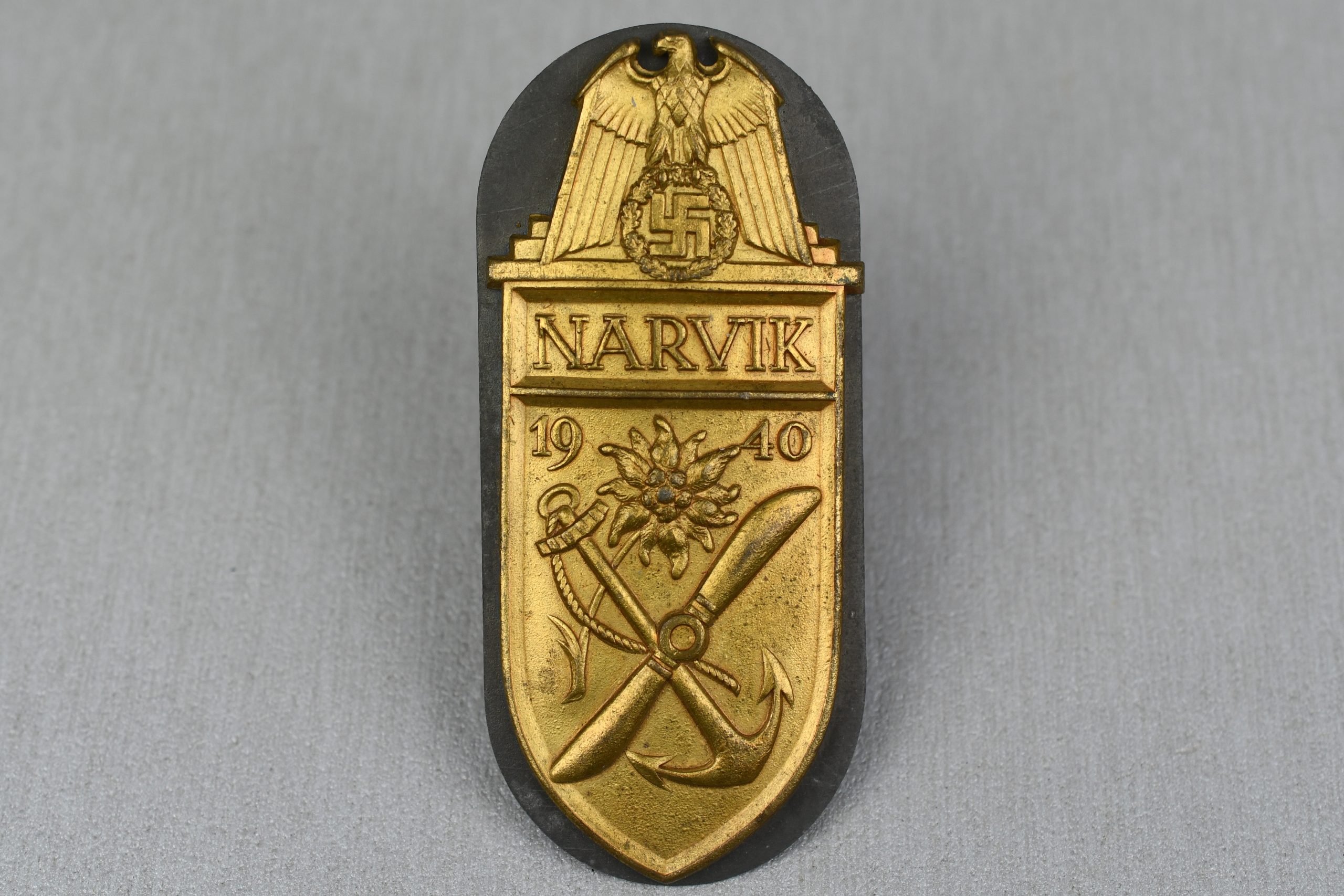 Very nice Narvik shield in gold for members of the Kriegsmarine. The front shows nice ageing and patina. Rare shield, missing the cloth navy blue backing. Still complete with back plate and 3 of the four prongs present.