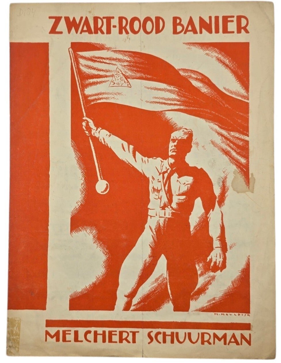 Original WW2 Dutch Collaboration NSB Document - Song Zwart-Rood Banier, Melchert SchuurmanSong Zwart Rood Banier by Melchert Schuurman. The drawing was made by M. Meuldijk. Has a stain on the cover middle right.Origineel Wo2 Nederlands Collaboratie NSB Document - Lied Zwart-Rood Banier, Melchert SchuurmanTekstblad Zwart Rood Banier door Melchert Schuurman, De tekening door M. Meuldijk. Heeft een vlek midden rechts.