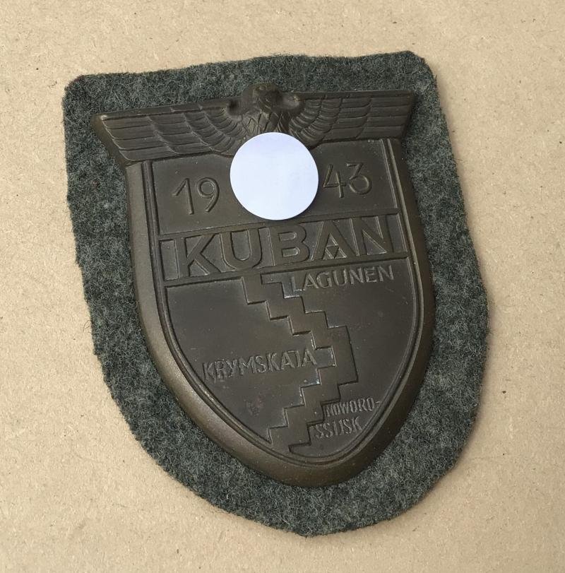 Original 1943 arm shield for the Kuban campaign. Complete with its original field grey wool army backing cloth and paper reverse.It was awarded to Wehrmacht forces who fought at the Kuban bridgehead in the Soviet Union from February 1943 until it was abandoned in October 1943. The award was instituted on 21 September 1943.Artifacts offered on this site are sold purely for their historical interest and any political affiliation, intonation or intention is most definitely not entertained. We sell purely for historical and educational purposes to only appropriate and approved collectors and historians and museums.