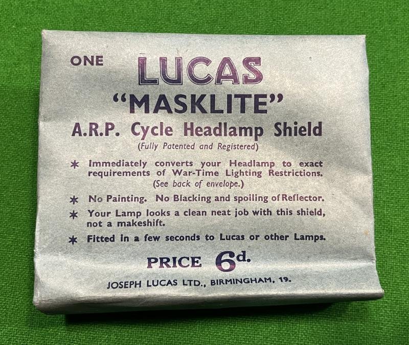 Lucas ' Masklite ' ARP Cycle Headlamp Shield contained in it's original card wrapping. The steel shield was designed to fit into existing cycle lamps to restrict the beam of the lamp to match the War time lighting restrictions. Shield generally in ,clean condition with some marking, wrapper with light marks and minor creases from storage.