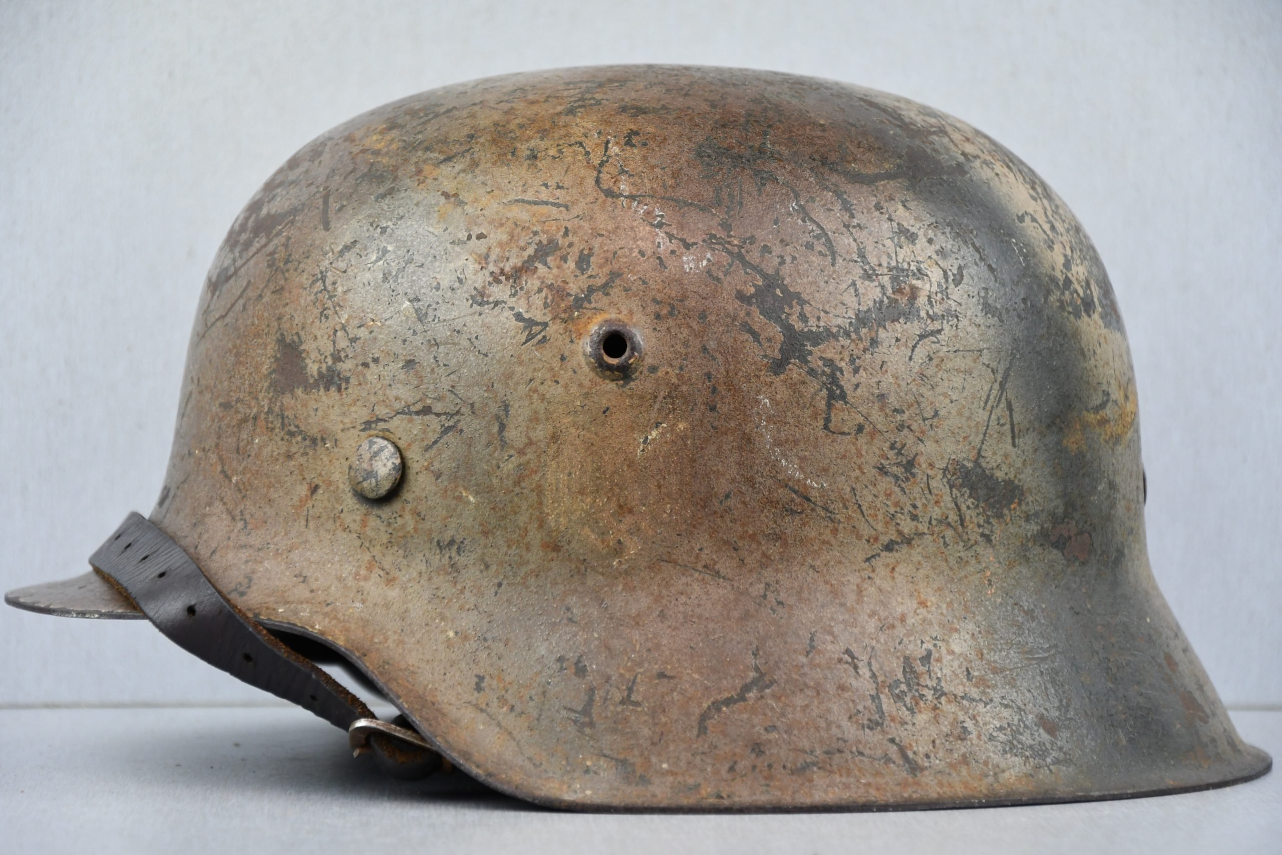 From my personal collection: A very attractive and original M42 German steel helmet, factory produced by HKP in size 64, with lot number 2729 stamped in the rear skirt. This example left the factory as a single decal helmet, which is consistent with the database for this lot number. The helmet was later camouflaged during wartime in a striking three-tone pattern, consisting of a beige base layer with green and red-brown striping, often referred to by collectors as the 'Normandy pattern.' The eagmle decal remains clearly visible under the paint.The helmet shows honest field wear, with scratches and natural aging to the camouflage paint, but the overall appearance remains very appealing and untouched. It retains its original liner with untouched and straight split pins, confirming that the liner has never been removed. The liner is a typical war time pigskin example, still complete with its original drawstring. The leather has a darker brown tone, likely due to oiling or greasing, a practice sometimes used by collectors to preserve the material.The helmet is complete with its original chinstrap dated 1943, although the buckle strap appears to be a replacement while the strap itself remains original. The liner band is dated 1940 and sized 56/57, matching the shell size of 64. Sourced from the United States and originating from a personal collection, this is a top-tier and highly desirable camouflage helmet in very nice condition, offering strong display value and collector appeal.