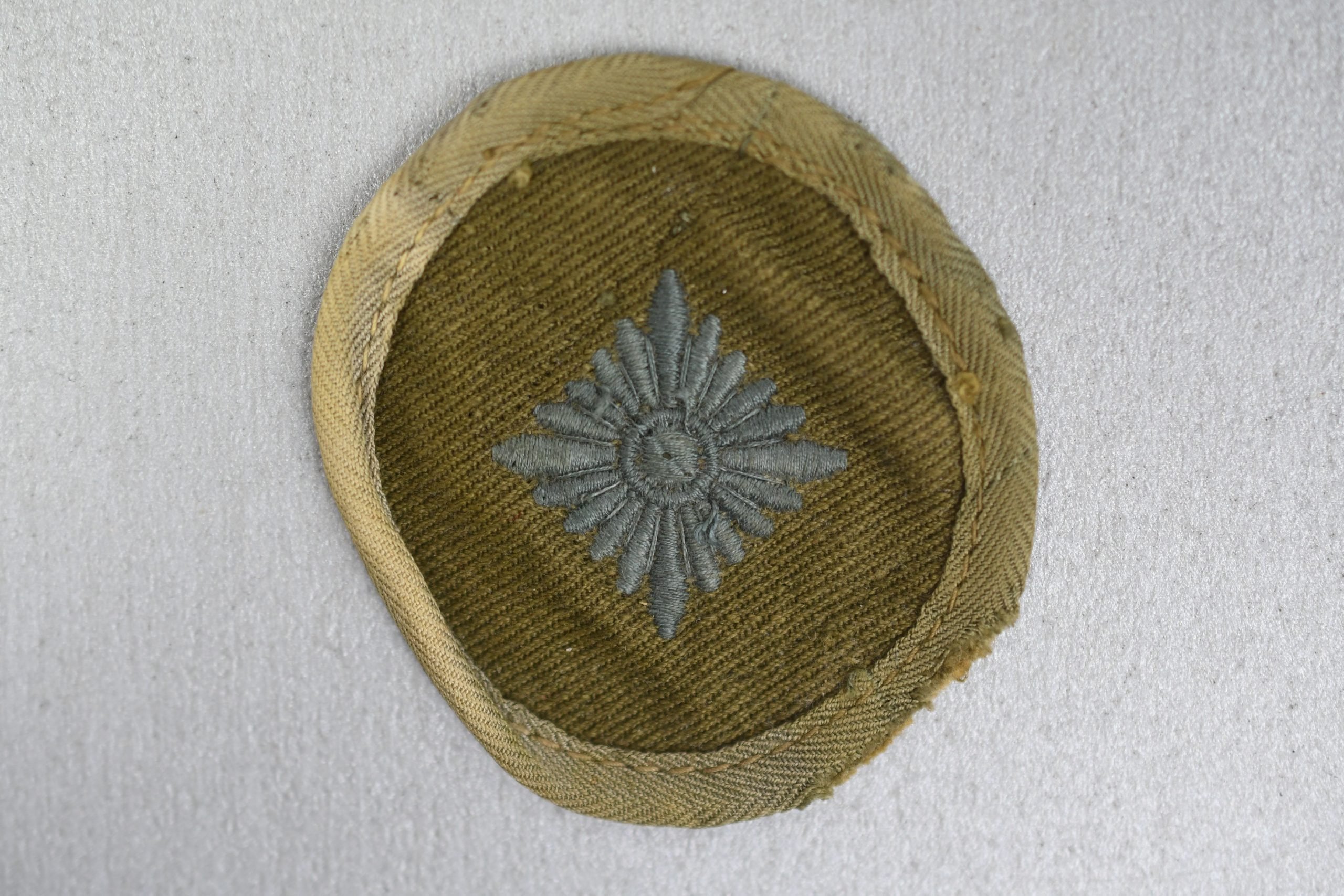 Uniform removed rank star tab for an Oberschutze of the german army. Tan colored example on canvas cloth for tropical use.