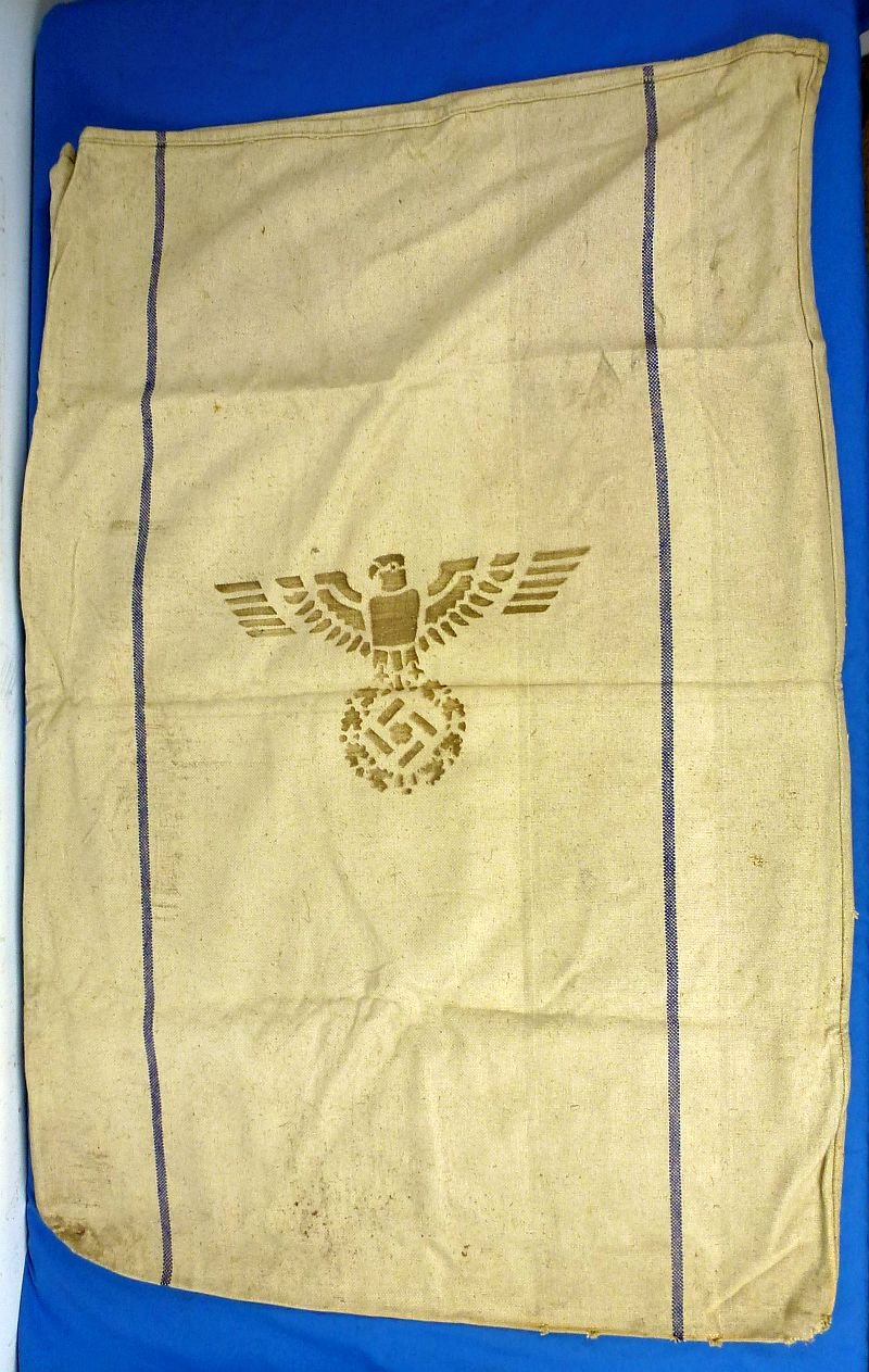The burlap bag is approximately 27 inches by 42 inches. One side bears the eagle and swastika emblem, while the opposite side bears the date of 1943 andthe designation of 'H. Vpfl' (for 'Heeresverpflegung'or 'Army Supply Service'). The bag shows spots and soiling from field use, but it is without holes or damage.