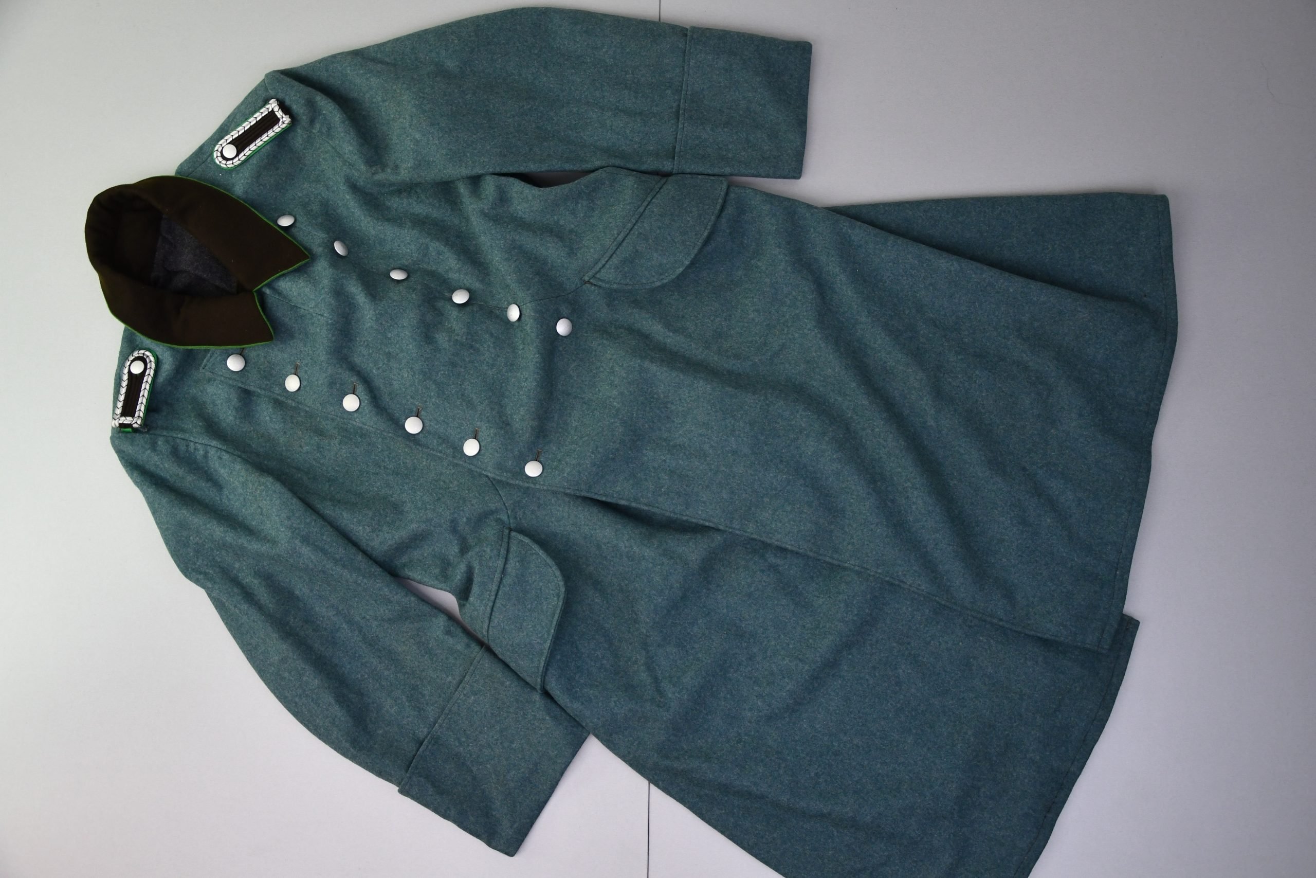 Outstanding wool field greatcoat for a member of the German Schutzpolizei. Unworn example in crisp – MINT – condition. Complete with slip-on shoulder boards for the rank of Oberwachtmeister. Nicely maker marked inside with what I think is 'Lippische Uniformfabrik' dated 1943 and also has a 'Po.' Police acceptance stamp. Void of damages or repairs. Very nice and vivid colors.