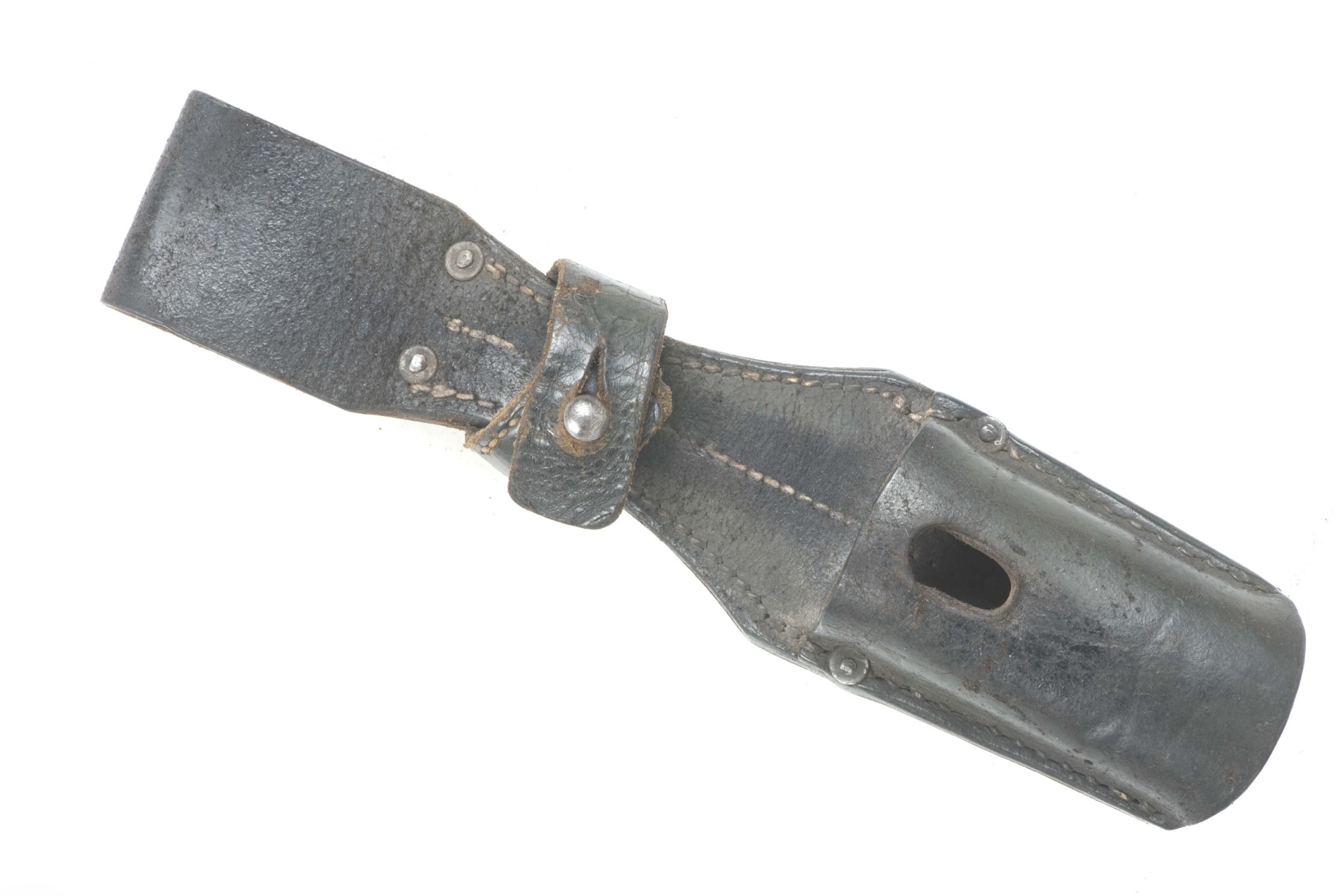 Very interesting green camouflaged K98 bayonet frog in very good condition. The frog is nicely marked J. De Valk, Amsterdam 1942 which indicates that it has been manufactured in The occupied Netherlands. The green camouflage paint is still clearly visible. Very rare, camouflaged K98 bayonet frog!